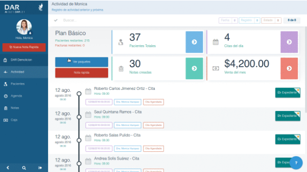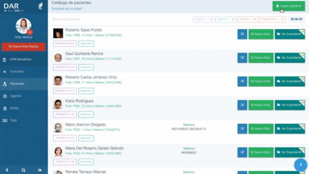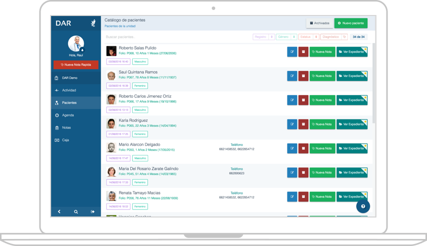 Historia clínica de cada paciente, cuadros clínicos, notas, solicitudes de estudios, citas, alergias, documentos y más